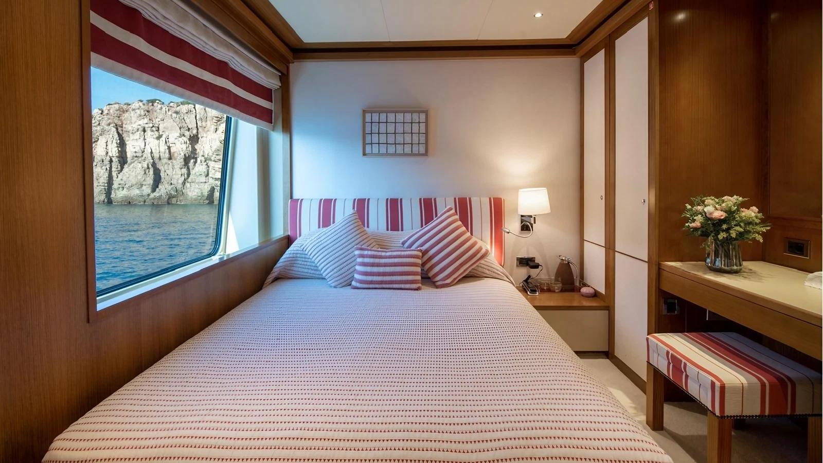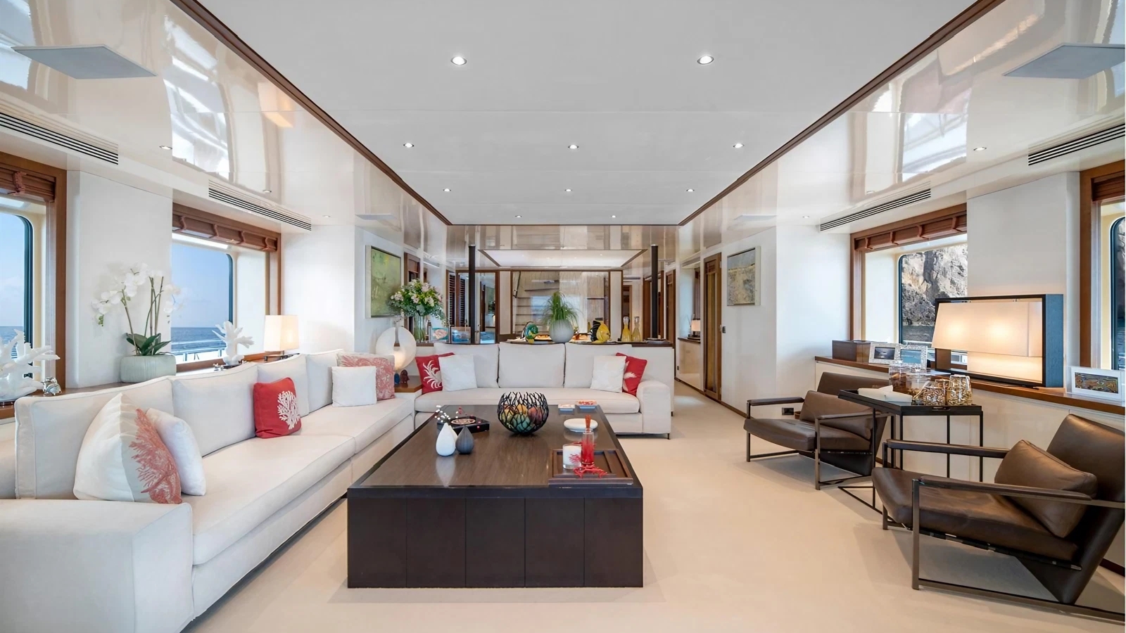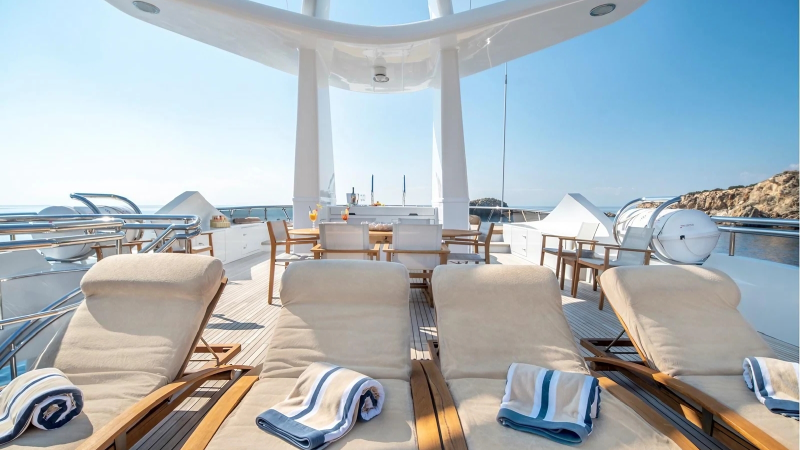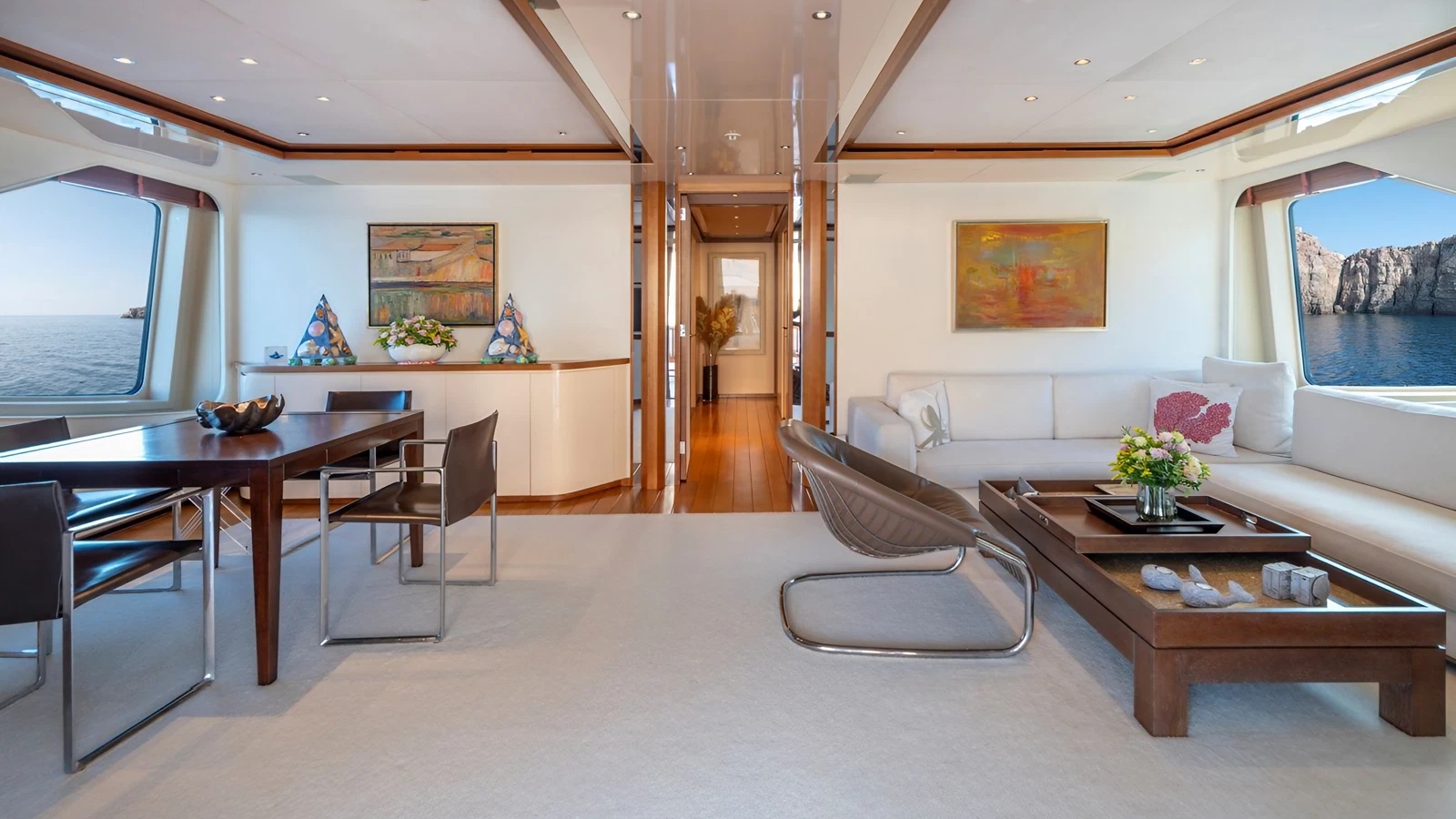 IRAVATI accommodates up to 12 guests in six beautifully designed cabins, including a master suite on the main deck. Attended by a crew of nine, the yacht offers comfort and sophistication, with interiors bathed in natural light and with panoramic views. Guests can enjoy versatile Dining options cater to every occasion, with a formal dining area on the main deck for sophisticated meals and a spacious al fresco dining area on the upper deck for meals under the open sky.